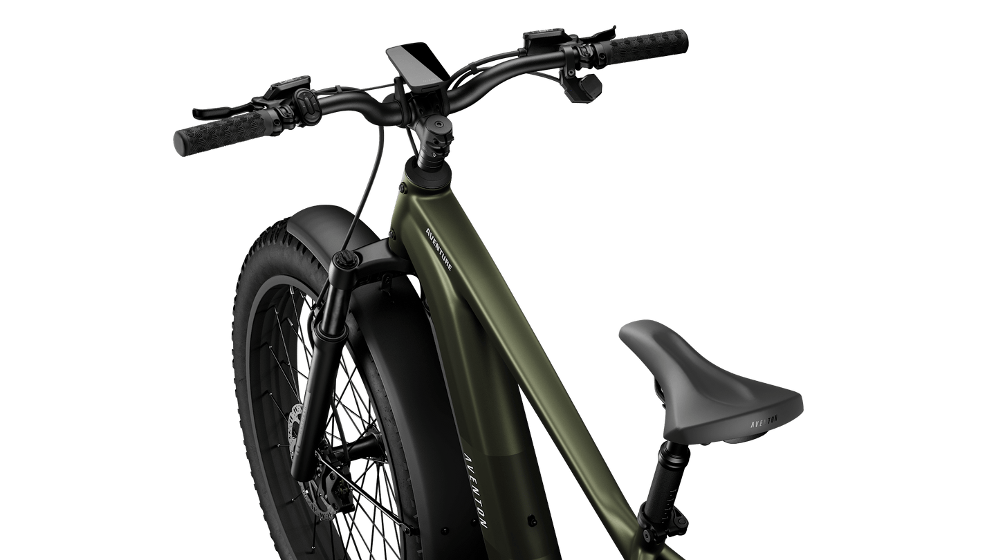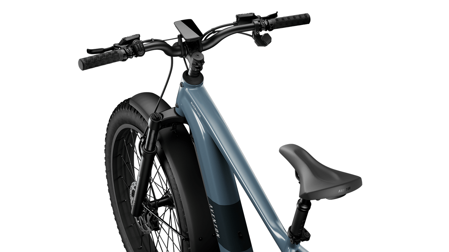 Aventure M is the perfect blend of rugged capability, performance, and technology to help you explore further than ever before. With meticulously designed frame geometry, a 80mm suspension fork, and 4.0" tires, there's nowhere the Aventure M can't take you. The Aventon A100 mid drive motor provides enough torque and power to conquer any terrain, giving you a responsive ride feel that can be easily customized with Ride Tune capabilities. With Aventon's electronic autoshift functionality ensuring you're always in the right gear at the right time, you can focus solely on the making it to the next mountain peak. ACU technology brings a host of connectivity and added security features including GPS tracking and an integrated lock, while the updated display brings you important metrics like torque, cadence, and power to help you maximize every ride. No matter where you want to go, Aventure M will get you there.