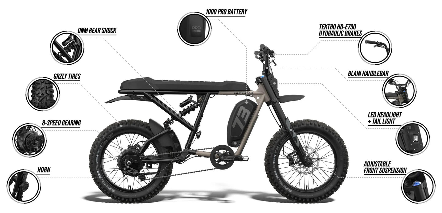 The Adventure Series flagship model and everything you could possibly want from our Performance Adventurer. We're redefining electric excellence with a new, UL2271 Compliant 1000 Wh removable battery, Tektro HD-E730 hydraulic brakes, full suspension, and improved weight distribution. If you're still craving more action, you're in luck because we also included a powerful new battery system that allows you to fully customize your range and power output. Each feature has been carefully curated to make this the best ride we have to offer. For riders 16 years of age and older.